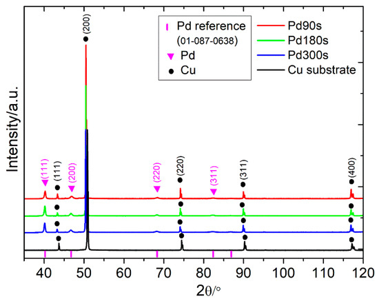 Diffractogram of the different Pd samples obtained by DHBT. The black curve shows the diffractogram of the copper substrate alone.