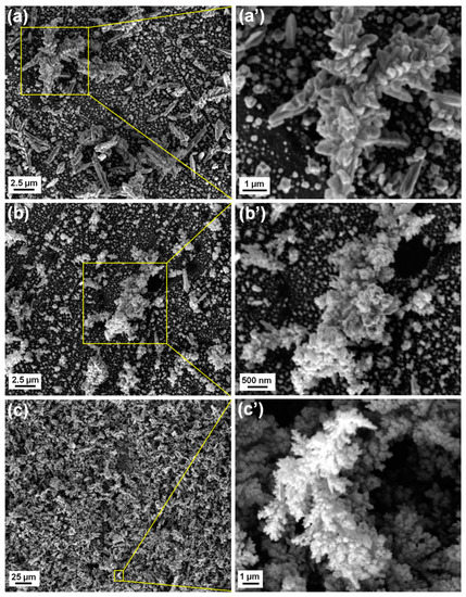 SEM images of (a) Pd90s, (b) Pd180s, and (c) Pd300s while (a’–c’) provide a closer look at the growing dendrites of the samples, respectively.