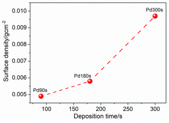 Relationship between the surface density of Pd samples and the deposition times. The dashed line is used as a guide for the eyes.