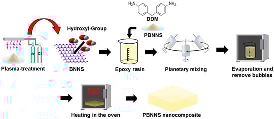 The fabrication process for the PBNNS/epoxy nanocomposites is shown schematically in Figure 2. The PBNNS (30 wt.%) were dispersed in acetone, sonicated for 30 min, then mixed with epoxy resins as in previous studies [35,36,37,38]. The PBNNS/epoxy resin and DDM were then mixed in a planetary mixer for 5 min at room temperature, followed by heating in a vacuum oven at 100 °C for 4 h to evaporate the acetone and remove any bubbles. The mixtures were then cured at 80 °C for 1 h, followed by post-curing at 180 °C for 4 h [39,40]. The specimens of as-received BNNS, the plasma-treated PBNNS, and the PBNNS nanocomposites are designated hereafter as the neat BNNS, the PBNNS, and the PBE nanocomposites, respectively.