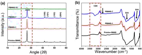 The XRD patterns of the pristine BNNS and the various PBNNS samples are presented in Figure 3a. Here, both spectra exhibit a peak at 2θ = 24° due to the (002) reflection plane of the 2-D structure arising from the oxidative degradation of BNNS and PBNNS. Moreover, the diffraction patterns of the PBNNS-1 and PBNNS-7 are similar to that of the pristine BNNS, each exhibiting a diffraction peak at 2θ = 45° due to the (100) crystal plane, thereby indicating that these three samples have the same characteristic crystalline structures. However, the XRD pattern of the PBNNS-10 is different from that of the pristine PBNNS, PBNNS-1, and PBNNS-7 samples, thus confirming that the crystalline structure of BNNS is destroyed by excessive plasma-treatment (i.e., more than 10 min), as has been observed previously [45,46,47].