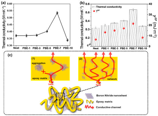 Thermal conductivity of the BNNS/epoxy nanocomposites: (a) thermal conductivity, (b) correlation between specific polar component of surface free energy and thermal conductivity, (c) a schematic representation of thermal conductivity mechanisms of Neat and PBE-7.