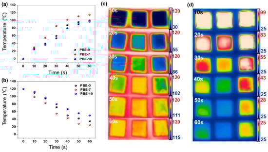 The change in heat absorption of the neat BNNS and the various PBE nanocomposites according to plasma-treatment time is indicated by the plots of temperature against heating time in Figure 7a and the corresponding infrared thermal camera images in Figure 7c–d. Here, the surface temperature of each sample is seen to increase with heating time, but the PBE-7 nanocomposite (Figure 7b) exhibits the highest temperature compared with the other samples over the same time period. Similarly, during the cooling process, the surface temperature of the PBE-7 nanocomposite decreases more rapidly than that of the other samples, reaching a minimum value and remaining stable thereafter. The faster heating and cooling rates of this sample indicate its higher thermal conductivity and rate of thermal diffusion [66].