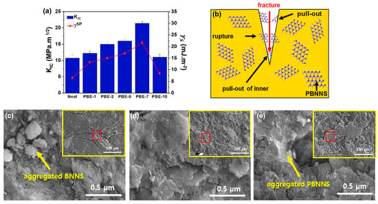 Fracture toughness of the BNNS/epoxy nanocomposites: (a) Correlation between specific polar component of surface free energy and KIC, (b) fracture mechanism, (c) fracture surfaces of the Neat, (d) PBE-7, and (e) PBE-10.
