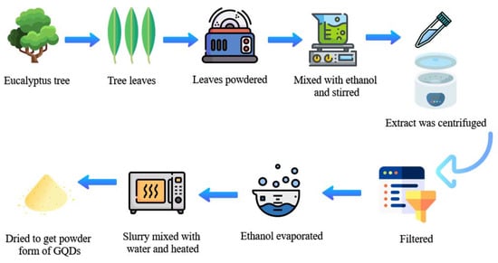 Eucalyptus tree leaves were collected, dried in oven for 5 h, and then ball milled the leaves to obtain fine powder. Subsequently, 10 gms of Eucalyptus tree leaves powder was mixed with pure ethanol solution, and this mixture was placed for continuous stirring for a time of 4 h at room temperature, and the resulting extract was centrifuged for 10 min at 8000 rpm for achieving a fine supernatant. Further, the obtained extract was filtered using a 0.22 micrometer filter and consequently concentrated by the evaporation of ethanol using a rotary evaporator till the residue slurry was obtained. This slurry was blended with a less sum of milli-Q water and heated in an oven at different temperatures (240, 260, 300, 320 °C) for different treatment times (360, 400, 440, 480, and 520 min), and subsequently, all sample residue was dispersed in absolute ethanol for properly dispersing the GQDs. The obtained dispersion was then filtered out using the syringe filter (0.22 μm) for obtaining the pure GQDs. These GQDs were then permitted for drying for 24 h at 65 °C to obtain the dried powder. The graphical diagram for the GQD synthesis from Eucalyptus tree leaves is shown in Figure 1.
