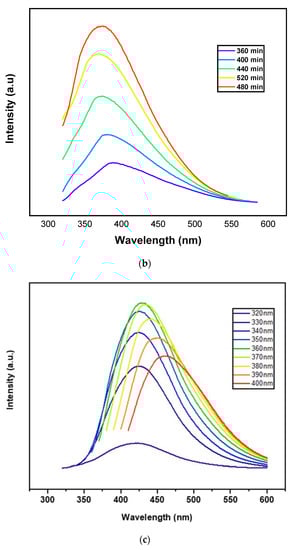 (a) PL of GQD at different temperatures (240, 260, 300, and 320 °C), (b) PL of GQD at different heat-treatment durations (360, 400, 440, 480, and 520 min) at a constant temperature of 300 °C (c) PL of GQD prepared at 300 °C after 480 min of treatment.