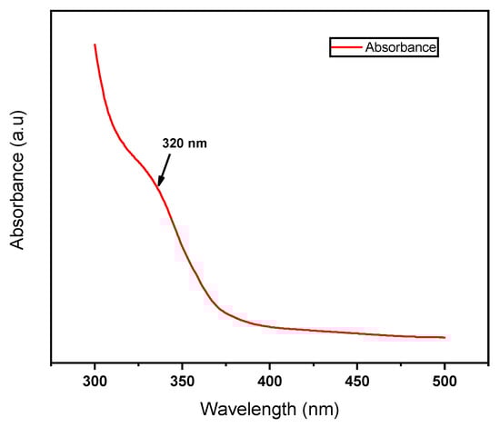 To additionally understand, the optical properties of GQDs prepared at 300 °C after 480 min of treatment (named GQD/300), these developed GQDs were examined thoroughly by UV–Vis absorption as well as photoluminescence emission spectroscopies. The optical properties of synthesized GQD/300 were explored by conducting the UV–Vis absorption. Usually, the absorption spectrum of graphene quantum dots appears in the UV region, and the tail extends toward the visible region. UV–Visible spectrum of GQD/300 as in Figure 3 shows a significant absorption at 300–320 nm which can be related to the π-π * and n-π * transition arising from aromatic C=C bonds (sp2 domain) and C=O groups, respectively [73]. The results suggested that the UV absorbance in the GQDs is associated with their surface oxygenated (C=O) states established at the time of reaction [74].