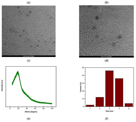 The TEM images of the synthesized GQD/300 are shown in Figure 4a,b. The structure of GQD/300 examined by TEM confirmed that the GQD/300 were noted to have a size in the range of 2 to 5 nm. Figure 4c shows the particle size distribution of GQD/300. This is in line with the results obtained by a research work completed by Kumawat et al. [53]. The synthesis of the GQD/300 may be because of the carbonization of the solution during the heat treatment in the autoclave. The material’s carbonization degree will support controlling the size of the GQD/300 developed. The resultant GQDs are single dispersed sphere particles, as observed. The mean size of the GQD/300 particle is (Figure 4c) around 3 nm, with a comparatively tapered size distribution between 3–5 nm (based on statistic evaluation of over 100 quantum dots).
