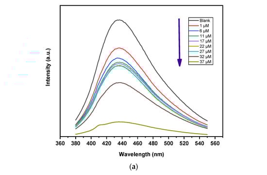By examining the variations in fluorescence intensity with different metal ion concentrations (1 μM, 6 μM, 11 μM, 17 μM, 23 μM, 28 μM, 32 μM, 37 μM, the variation in fluorescence intensity of GQD/300 was tracked. The variation in intensity was used to estimate the sensitive response of GQD/300. The analytical performance of the GQD/300 sensing system was performed in order to show the method’s sensitivity as well as for the quantitative study of the PL response of the GQD/300 towards different metal ions. The affinity (coordination) of several metal ions toward GQD/300 was assessed thoroughly under comparable experimental conditions. Figure 5b demonstrates that among sixteen different metal ions, the Fe3+ ions have the largest affinity (Figure 5b) for GQD/300, indicating the possibility of selective sensing by GQD/300.