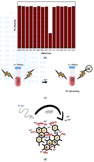 With the world’s rapid development in several sectors, the possibility of excessive pollution ejection into the environment has increased [1,2,3]. As a result, environmental water pollution caused by harmful metal ions has developed as one of the most serious issues faced by humans [4,5]. In every aspect of daily life, water is crucial and as a result, it is extremely important to have access to clean and potable water. Wastewater such as produced water can be treated properly for various applications. Polluted water might contain hazardous metal ions such as Pb2+, Hg2+, Fe3+, Fe2+, Cu2+, Cd2+, Co2+, Ni2+, Al3+, and Ag+ [6,7,8,9,10], and these metal ions can combine to produce dangerous solution compounds which can turn out to be toxic [11,12,13]. These toxic compounds do not disintegrate and are non-degradable. As a result, these compounds keep building up in the soil and eventually reach human bodies [14,15]. Since these problems have become a serious issue, the field of toxic metal ion sensing has become more popular among the research communities [16,17,18]. To detect harmful metal ions, numerous types of sensing systems combined with various materials have been developed, and graphene-based materials are having good potential in sensing applications [19,20,21,22]. The main limitations of the conventional metal sensing methods include low selectivity, instability, difficult on-site sampling, and poor compatibility in the aqueous environment. Given that metal ions have a direct relationship with environmental water pollution, it is extremely desirable to design and develop effective as well as selective fluorescent sensors for metal ion detection applications [22]. Fe3+ ions have always drawn a lot of attention among the different heavy metal ions, as it is difficult to identify and remove them. In general, it is necessary to monitor and maintain a balanced iron proportion in biological as well as environmental systems [23]. As metal ions might cause adverse impacts on human as well as environmental health, the usage of GQDs as fluorescent probes to detect metal ions has received good research attention recently. The metal ion Fe3+ performs an important role in both biological as well as ecological processes. In biological systems, Fe3+ ions might coordinate with several types of regulatory proteins. Excessive Fe3+ ions may lead to cytotoxicity, creating their concentration a vital marker for Parkinson’s disease. Therefore, the proper monitoring of Fe3+ pollution is very crucial [24]. Hence, there is a requirement for highly sensitive and specific sensors of Fe3+ concentrations in both the environment and biological systems. Due to its fascinating characteristics, such as chemical inertness, low toxicity, high solubility, persistent photoluminescence (PL), good surface grafting, etc., graphene quantum dots (GQDs) have recently begun to be recognized as a material to develop an advanced novel type of fluorescence sensor. There are several studies carried out using GQDs for improving water treatment efficiency and works related to the environmental impact of nanomaterials [25,26].