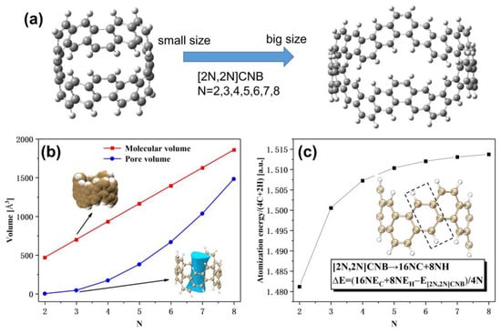 (a) Schematic diagram of the geometric structure of [2N,2N]CNB, with gray (white) spheres representing carbon (hydrogen) atoms. (b) Molecular volume and pore volume of [2N,2N]CNB. (c) The atomization energy per (4C + 2H) of [2N,2N]CNB. EC and EH are the electron energies of carbon and hydrogen atoms, respectively.