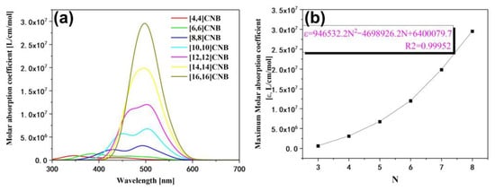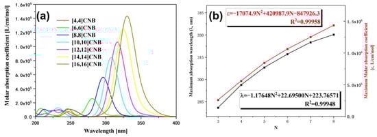 (a) OPA spectrum of [2N,2N]CNB. The absorption peak of the absorption spectrum is broadened by a Gaussian function, FWHM = 0.5 eV. (b) The relationship between the wavelength and of the maximum absorption peaks of [2N,2N]CNB and the size.