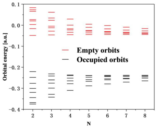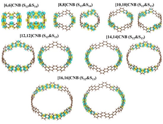 In this section, we calculate the UV–Vis absorption spectra of [2N,2N]CNB (Figure 2a). The strongest absorption peaks of [2N,2N]CNB all appear in the near-ultraviolet region. Moreover, with the increase in size, the strongest absorption peaks of [2N,2N]CNB gradually redshift. It is a common phenomenon that the absorption peaks of -conjugated systems gradually redshift with an increase in size, which is caused by the increase in occupied orbital energy and the decrease in empty orbital energy [29]. The change in the energy levels of the 10 highest occupied orbitals and the 10 lowest empty orbitals of [2N,2N]CNB can be clearly seen in Figure 3. When N = 3, 4, 5, 6, 7, and 8, the wavelength of the strongest absorption peak of [2N,2N]CNB has strong regularity. We supply the orbital contribution of the excited states with the strongest oscillator of [2N,2N]CNB in the Supporting Information (Tables S1–S14). We complete a quadratic fit to the size and wavelength of [2N,2N]CNB, and the result is perfect () (Figure 2b). This also shows that the wavelength of the strongest absorption peak of any size [2N,2N]CNB can be calculated according to this formula. To describe the electronic excitation characteristics of [2N,2N]CNBs with different sizes, we visualize the transition behavior of electrons by means of charge-density difference (CDD) maps [30,31,32,33]. The electron-hole density is defined as