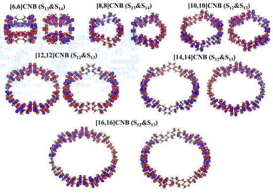 The strongest absorption peaks of [2N,2N]CNB are both contributed to by a pair of degenerate excited states, and the pair of degenerate excited states are complementary in the transition region of the whole molecule. This is caused by the symmetry of [2N,2N]CNB. By observing the CDD diagrams, it can be found that the transitions corresponding to the maximum absorption peaks of [2N,2N]CNB with different sizes are transitions (Figure 4). The transition dipole moment density reflects the magnitude of the transition dipole moment, and the magnitude of the transition dipole moment is proportional to the oscillator strength of the excited state. It can be seen that the transition dipole moment density is mainly distributed on both sides of the [2N,2N]CNB (Figure 5) that corresponds to the CDD. In addition, with the increase in the size of [2N,2N]CNB, the transition dipole moment also increases gradually. This is also the reason why the of the strongest absorption peak increases gradually with the increase in the size of [2N,2N]CNB.