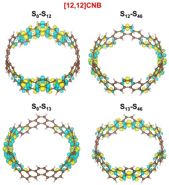 The strongest absorption peaks of the TPA spectra of [2N,2N]CNB are located at 500 nm, and the increases continuously with the increase in size (Figure 6a). The relationship between the size of [2N,2N]CNB and the maximum is also fitted (Figure 6b), and the curve is a quadratic function curve with a gradually increasing slope, which indicates that the gradually increased with the increase in size. Unlike the OPA spectrum, the TPA spectrum does not show a redshift of the absorption peak. By visualizing the charge transfer of the [2N,2N]CNB during the TPA process, it is found that the intermediate state in the transition process is the pair of degenerate states with the strongest oscillator intensity in the OPA spectrum. This is because this pair of degenerate states has the strongest transition dipole moment. Taking [2N,2N]CNB as an example, the strongest TPA peak of [2N,2N]CNB is contributed to by S46, S12, and S13, which are the intermediate states of S46. (Figure 7). The first-step transition of the two transition channels is the same as that of the OPA transition. The second-step transition is also a local excitation at both ends of the molecule, and the excitation region and the first-step transition are in a complementary state. The two-photon electronic transition processes of CNBs with different sizes are shown in Figures S1–S6. The second-step transitions of [6,6]CNB and [8,8]CNB are localized excitations located throughout the molecule. The two-photon transition process of [10,10]CNB, [14,14]CNB, and [16,16]CNB is the same as that of [12,12]CNB.