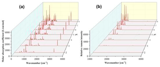IR spectra (a) and Raman spectra (b) of [2N, 2N]CNB. The peaks of the infrared and Raman spectra are broadened by the Lorentz function, FWHM = 8.0 cm−1.