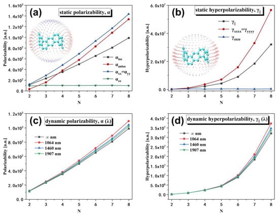 The polarizability of [2N,2N]CNB shows obvious anisotropy (), which is due to the increase in the size of [2N,2N]CNB along the xy direction (Figure 10a). This results in the delocalized electrons on the [2N,2N]CNB having a wider delocalized space in the xy plane under the action of the external field. As the size increases, the isotropic average polarizability () of the CNBs gradually becomes larger. Studies have shown that the polarizability of the system is positively correlated with the volume [35], which is also consistent with our conclusion. and are equal and grow gradually with size. However, does not change significantly with the increase in the size of [2N,2N]CNB. This is because the size of [2N,2N]CNB does not change in the z direction. Like the polarizability, the of [2N,2N]CNB also exhibits strong anisotropy (Figure 10b). In addition, with the increase in size, the enhancement of the is obvious, showing a nonlinear trend. From the unit sphere of the static (second hyper)polarizability tensor, it can be seen that the static (second hyper)polarizability at the xy plane reaches a maximum value, and, as the angle to the xy plane increases, the static (second hyper)polarizability gradually decreases. Next, we calculated the dynamic and of [2N,2N]CNB at external fields of 1064, 1460, and 1907 nm. It can be seen that the frequency-containing and of [2N,2N]CNB gradually increase with the enhancement of the external field (Figure 10c,d). It is well understood that the stronger the external field is, the more polarized the electrons will be. To clarify the relationship between the size of [2N,2N]CNB and the (second super)polarizability, we separately fit the function of the and as a function (Table 1 and Table 2) of size under different external fields (1064, 1460, 1907, and ∞ nm). The fitting results are very satisfactory, with for all functions. The excellent fitting results can be used to predict the static/dynamic and of [2N,2N]CNBs of arbitrary size.