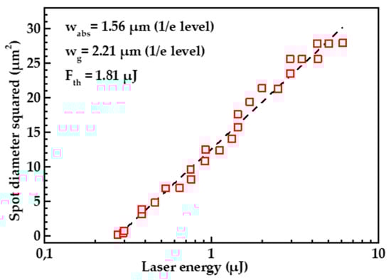 Figure 1 demonstrates the diameter of a crater formed on the diamond surface due to the femtosecond pulse irradiation as a function of the pulse energy. Since in the given coordinates (the square of the laser crater size–the logarithm of energy), this dependence is very close to a linear function, the absorbed energy profile is close to a Gaussian one: , where F is the local fluence of absorbed energy; r is the distance from the center; and is the Gaussian radius of the absorbed energy profile, which shows at what distance from the center the amount of absorbed energy drops e times. The parameter calculated from the above dependence was μm.
