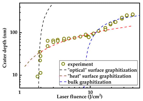 In fact, the measured crater depth (Figure 2) determines the distance that the graphite phase moves into the bulk of the crystal. It is clearly seen that the dependence is complex, which, in our opinion, can be explained by considering three different regimes of the graphitization of the diamond surface under single-pulse laser irradiation.