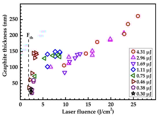 The thickness of the graphitized layer as a function of the laser fluence is shown in Figure 3. The data presented combines the results of measurements performed at different points of laser spots produced at different energies. The absolute values of the thickness of the graphitized layer are in reasonable agreement with the depth of propagation of the graphitic front (Figure 2), taking into account the change in the specific density of the diamond during graphitization (see Supplementary Materials). Moreover, there is a clear correlation between these values, despite the significant scatter of thickness data due to both the above interference instability and the inhomogeneity of the sp2 phase structure over the layer []. This correlation is expected since the given data describe the same process of the penetration of graphite into diamond under single-pulse irradiation.