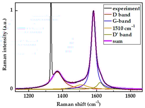 All carbon substances have common features in their Raman spectra. These are the so-called G and D peaks with maxima at 1580 and 1350 cm−1, respectively []. The spectral position, intensity, and FWHM of these peaks are used to describe the structure of sp2 carbon materials. These bands have different natures. The G-band is a doubly degenerate (TO and LO) phonon mode (E2g symmetry) at the center of the Brillouin zone. In the presence of defects in sp2 carbon materials, the Raman spectrum always contains the D band. The origin of the D peak in carbon materials is well-established to be related to defect-induced double-resonant scattering [,], so its spectral position and FWHM depend not only on the concentration and types of defects but also on the laser wavelength in Raman measurements. The double-resonance model provides a deep understanding of the most experimental observations of the D peak. Within this model, the defect-induced Raman process consists of four virtual transitions: (i) a laser-induced excitation of an electron/hole pair through the energy gap between the conduction and valence bands at the k point; (ii) inelastic scattering of the excited electron by a phonon with an exchanged momentum q that is close to the k point of the graphite Brillouin zone; (iii) elastic scattering of an electron by a lattice defect; and finally, (iv) electron/hole recombination with the conservation of k []. Obviously, the second and third steps in these transitions can be interchanged. The D peak is activated during an inter-valley process, whereas another disorder-induced peak, the D′ band at ~1620 cm−1, originates from a double-resonance intra-valley process connecting two points in the same Dirac cone around the k (K′) point [].