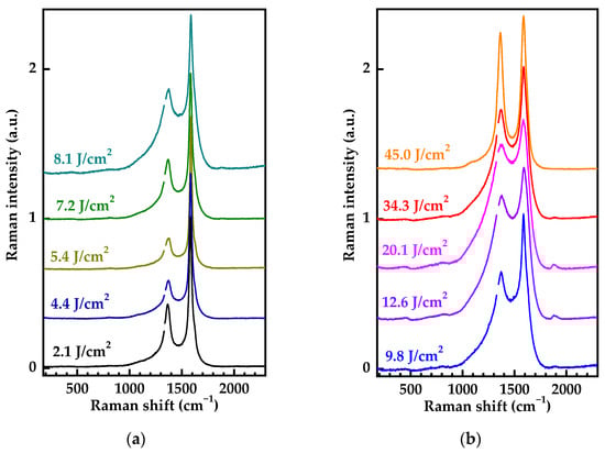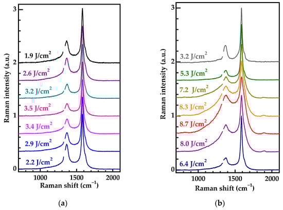Raman spectra of graphitized structures obtained at lower (a) and higher (b) laser fluences. All the spectra are normalized to the amplitude of G-band and shifted for clarity.