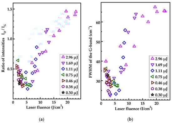 (a) The ratio between intensities of the D- and G- bands and (b) FWHM of the G band in the Raman spectra versus the laser fluence. Legends denote the pulse energies at which the spots explored were produced.
