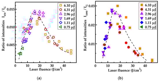 The trend of change in the structural perfection of the graphitized phase in the 1.11 μJ spot was reversed (Figure 5b) and coincided with that what was observed earlier []. Moreover, the increase in the local laser fluence resulted in the significant broadening of the D- and G-bands, thus indicating the gradual disorder of the HOG phase. The closer one got to the spot center, the higher the disorder degree was. It is noteworthy, that at the spot edge where the laser fluence was low (from 3.2 to 5.3 J/cm2), the structural perfection returned to the trend found for the nonablative graphitization.