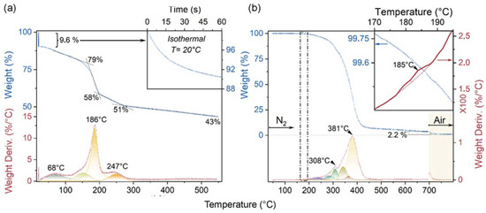 TGA (blue curves) and DTGA (red curves) plots of GO sheets (a) and 2 wt.% GO-loaded PU leather layer (b), obtained under N2 (up to 700 °C) or air flow (from 700 °C up to 800 °C). In the insets of (a,b), the isothermal treatment of GO at 20 °C under N2 gas flow and the thermograms zoomed in to the 170–195 °C interval for the GO-loaded PU leather layer are shown, respectively.