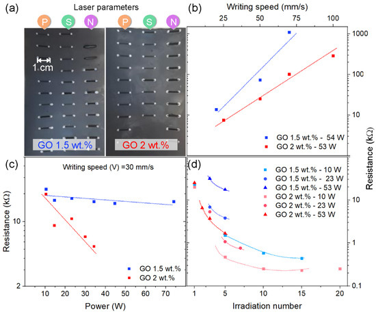 Effect of laser processing parameters (P: laser power; S: writing speed, and N: irradiation number): (a) pictures of 10 mm paths obtained on GO-loaded PU layers (GO 1.5 wt.% and GO 2 wt.%); (b–d) electrical resistance (R) for the 10 mm long paths fabricated by changing different writing speeds, laser powers, and number of irradiations along the same path, respectively.