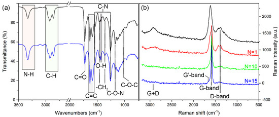 GO/PU top layer: (a) ATR spectra before (black line) and after laser irradiation (blue line); (b) Raman spectra before (black line) and after 1, 10, and 15 repeated laser treatments (red, green, and blue line, respectively).