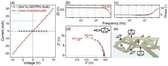 In Figure 7a, DC current–voltage (I–V) properties obtained by four-wire resistance measurements on the laser-irradiated path are compared with the bulk properties of GO/PU polymer composite leather (2 wt.% of GO). In this figure, a linear dependence between the current and the voltage drop within a ±10 V interval is shown as compared to the GO/PU polymer composite leather. It is clear that the laser-irradiated paths were the only electrically conductive regions, while the surface not treated with laser and the bulk of the GO/PU leather were both insulating. It is worth mentioning that the linearity and ohmic behavior suggest the formation of a continuous path, which is usually observed for carbon-based polymer composites under DC measurements over the electrical percolation threshold [4,6,7,53,54]. The laser-irradiated region can be described as a linear resistance component with moderate electrical resistance, which is calculated to be c.a. 320 per 10 mm of track linear length as obtained from the slope of the red curve. No relevant variations between four-probe and two-probe DC resistance measurements were obtained. Together with the confirmation of DC electrical properties, and for a more complete investigation, impedance measurements were also performed in the small-frequency domain to model electrical properties with the structure of the conducting paths and with junctions between different conductive particles.
