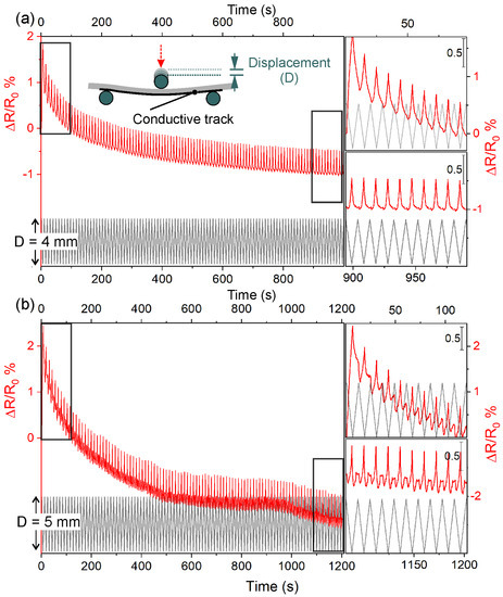 From this figure, it is clear that ΔR/R0 rapidly decreased in the first 10–20 deformation cycles due to a plastic deformation. Then, it was more constant (see top and bottom insets in Figure 10) up to 500 cycles. Notwithstanding the synchronization between the piezoresistive signal and displacement, the ΔR/R0 profile was a bit asymmetrical. This asymmetry corresponded with the displacement return regions.