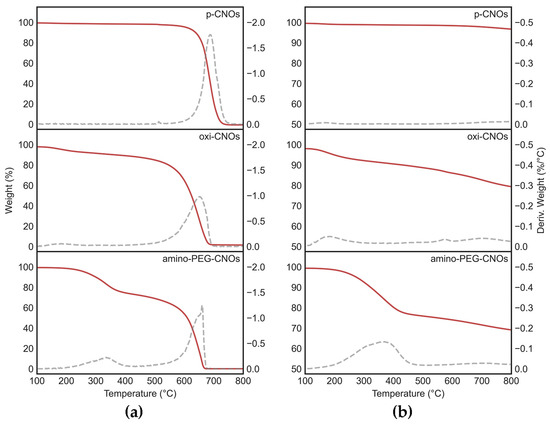 TGA data in (a) air and (b) nitrogen atmosphere of p-CNOs, oxi-CNOs, and amino-PEG-CNOs. Weight loss (red lines) and its first derivative over temperature (grey dashed lines) were consistent with the covalent functionalization of CNOs.