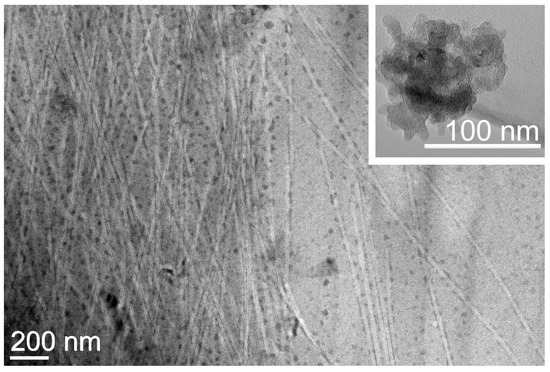 Transmission electron microscopy (TEM) imaging revealed a network of highly homogeneous fibrils of 21 ± 2 nm (n = 50) diameter that interacted on their surface with individual CNOs that appeared to be well-dispersed within the matrix (Figure 5). This result contrasts the TEM images of oxi-CNOs without the peptide, which instead displayed large aggregates (inset in Figure 5 and Figure S15), as is typically observed for CNMs. Overall, the TEM images confirmed the positive effect of the peptide on oxi-CNOs dispersibility, as well the positive effect of CNOs on the peptide, since their presence hindered the undesirable hierarchical assembly into bundles of fibrils and fibers of heterogeneous diameters that were observed instead in the case of the peptide alone, or with other nanocarbons [68].
