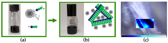 Photographs of: (a) Lff-PEG-CNOs (N-terminus approach) with the self-assembling tripeptide Lff in alkaline (pH 11.8) sodium-phosphate precursor solution; (b) nanocomposite supramolecular hydrogels with Lff-PEG-CNOs (1.0 mg/mL) and 2.5 mg/mL of Lff at pH 7.4. (c) Raman mapping of a hydrogel fiber; intensity scalebar: brighter cyan areas correspond to higher levels of Lff-PEG-CNOs.
