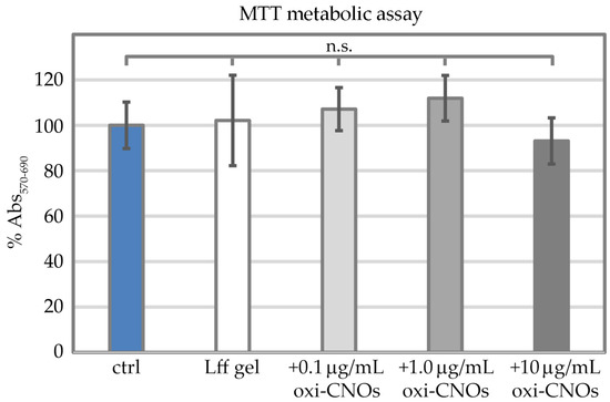 MTT metabolic assay on fibroblast cells grown on the plastic control (ctrl), the peptide gel without (Lff gel) or with increasing concentrations of oxi-CNOs (+0.1, +1.0, or +10 μg/mL oxi-CNOs). No statistically significant (n.s.) difference was found between tested conditions (p > 0.05).