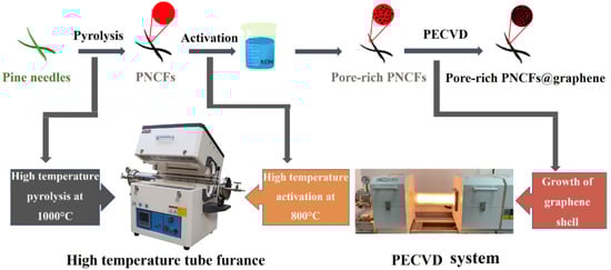 Herein, we use pine needles as raw materials and carbonize them into carbon fibers (coded as PNCFs) to integrate with graphene after an activation treatment. The activation treatment is conducted by a combined process of KOH immersion and calcination. The growth of graphene is carried out on the surface of pore-rich PNCFs by virtue of plasma-enhanced chemical vapor deposition (PECVD) [,]. Figure 1 depicts the preparation process of the pore-rich PNCFs@graphene core-shell composite. This core-shell composite can achieve a maximum EMI shielding effectiveness of ~77 dB in the X-band, higher than its precursor (pore-rich PNCFs, 52 dB). Moreover, the absorption shielding effectiveness (SEA) and reflection shielding effectiveness (SER) of the pore-rich PNCFs@graphene account for 90.8% and 9.2% of the total effectiveness, respectively, revealing an absorption-dominate EMI shielding mechanism. In addition, a possible mechanism analysis on the EMI shielding process is proposed.