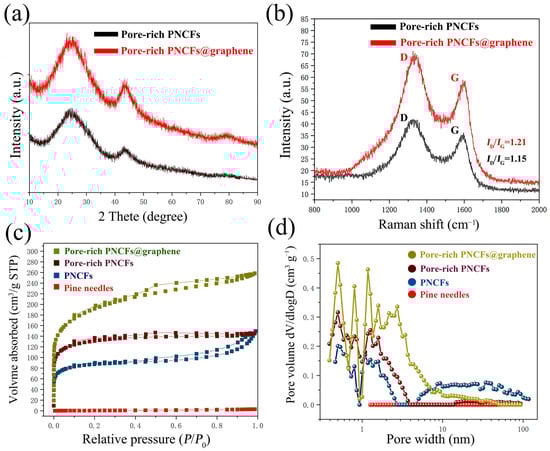 Analysis of the crystal structure, chemical composition, and pore structure of the pore-rich PNCFs@graphene composite: (a) XRD patterns; (b) Raman spectra; (c) N2 adsorption–desorption isotherms; (d) DFT model incremental pore volume vs. pore width.