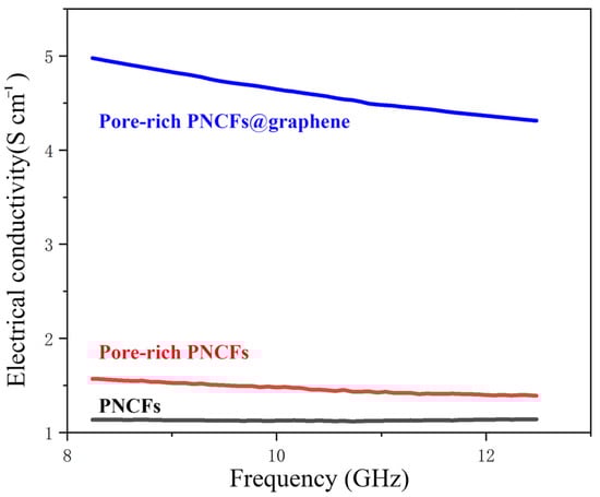 where f is frequency, ε0 is the permittivity of free space (ε0 = 8.854 × 10−12 F/m), and ε″ is the imaginary permittivity [,]. The electrical conductivity of the PNCFs, pore-rich PNCFs, and pore-rich PNCFs@graphene are depicted in Figure 5. The electrical conductivity of the PNCFs that are pyrolyzed from the pine needle product reaches 1.13 S cm−1, and the conductivity of the pore-rich PNCFs rises to 1.57 S cm−1. The difference between them is mainly attributed to the construction of conductive networks. The conductive networks promote the movement of charge carriers and provide more pathways for the transport of electrons in the pore-rich PNCFs, thereby improving the electrical conductivity of pore-rich PNCFs. The unique graphene “shell” in the composite is very important in improving conductivity. Due to the high conductivity of the graphene shell in the pore-rich PNCFs@graphene, the pore-rich PNCFs@graphene reaches 4.97 S cm−1 at 8.2 GHz, 216.6% higher than that of the pore-rich PNCFs (1.57 S cm−1). High electrical conductivity facilitates the efficient mobilization of charge carriers in the pore-rich PNCFs@graphene, which leads to the promotion dissipation of incident electromagnetic waves on the surface of the core-shell composite and improves the EMI SE of the composite.