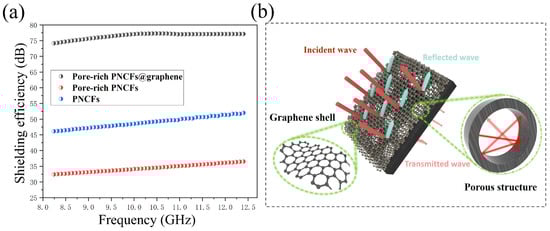 (a) SET values of the PNCFs, pore-rich PNCFs, and pore-rich PNCFs@graphene; (b) EMI shielding mechanism of the pore-rich PNCFs@graphene core-shell composite.