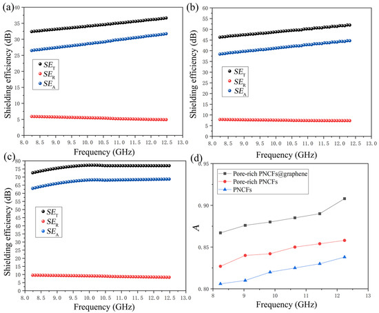 To estimate the mechanism of material dissipating electromagnetic waves more accurately, the EMI absorptivity A (A = SEA/SET) of PNCFs, pore-rich PNCFs, and pore-rich PNCFs@graphene are further analyzed. A can be approximately expressed as [,]: