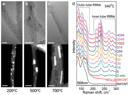 - Kharlamova, M.V.; Kramberger, C. Temperature-Dependent Growth of 36 Inner Nanotubes inside Nickelocene, Cobaltocene and Ferrocene-Filled Single-Walled Carbon Nanotubes. Nanomaterials 2021, 11, 2984. [Google Scholar] [CrossRef] [PubMed]
