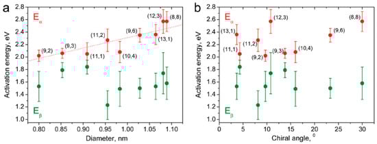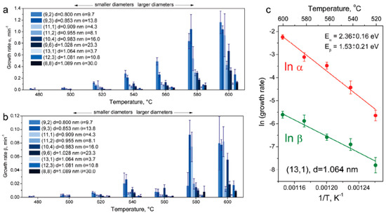 - Kharlamova, M.V.; Kramberger, C. Metal Cluster Size-Dependent Activation Energies of Growth of Single-Chirality Single-Walled Carbon Nanotubes inside Metallocene-Filled Single-Walled Carbon Nanotubes. Nanomaterials 2021, 11, 2649. [Google Scholar] [CrossRef]