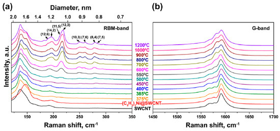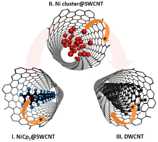 - Kharlamova, M.V.; Sauer, M.; Egorov, A.; Kramberger, C.; Saito, T.; Pichler, T.; Shiozawa, H. Temperature-dependent inner tube growth and electronic structure of nickelocene-filled single-walled carbon nanotubes. Phys. Status Solidi (B) 2015, 252, 2485–2490. [Google Scholar] [CrossRef]