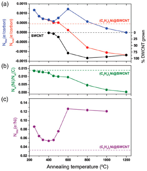 - Kharlamova, M.V.; Sauer, M.; Saito, T.; Sato, Y.; Suenaga, K.; Pichler, T.; Shiozawa, H. Doping of single-walled carbon nanotubes controlled via chemical transformation of encapsulated nickelocene. Nanoscale 2015, 7, 1383–1391. [Google Scholar] [CrossRef] [PubMed]