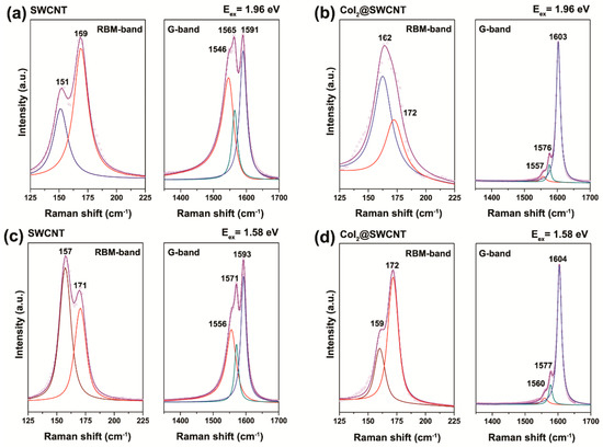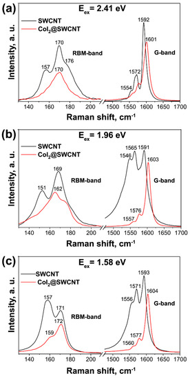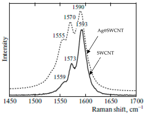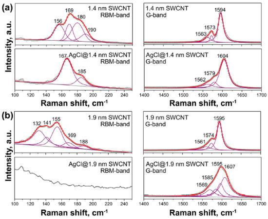 - Kharlamova, M.V.; Kramberger, C.; Mittelberger, A.; Yanagi, K.; Pichler, T.; Eder, D. Silver Chloride Encapsulation-Induced Modifications of Raman Modes of Metallicity-Sorted Semiconducting Single-Walled Carbon Nanotubes. J. Spectrosc. 2018, 2018, 5987428. [Google Scholar] [CrossRef]