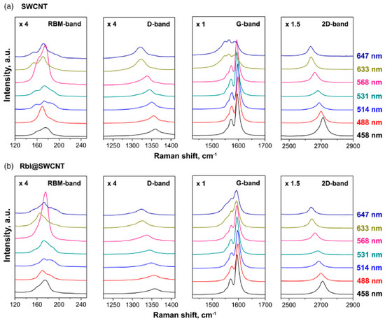 - Kharlamova, M.V.; Kramberger, C.; Rudatis, P.; Yanagi, K.; Eder, D. Characterization of the Electronic Properties of Single-Walled Carbon Nanotubes Filled with an Electron Donor—Rubidium Iodide: Multifrequency Raman and X-ray Photoelectron Spectroscopy Studies. Phys. Status Solidi (B) 2019, 256, 1900209. [Google Scholar] [CrossRef]