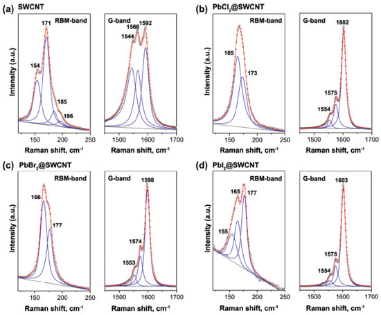- Kharlamova, M.V. Rare-earth metal halogenide encapsulation-induced modifications in Raman spectra of single-walled carbon nanotubes. Appl. Phys. A 2015, 118, 27–35. [Google Scholar] [CrossRef]