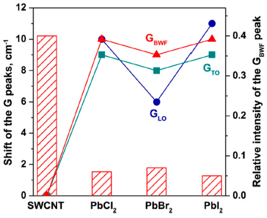- Kharlamova, M.V.; Kramberger, C.; Rudatis, P.; Pichler, T.; Eder, D. Revealing the doping effect of encapsulated lead halogenides on single-walled carbon nanotubes. Appl. Phys. A 2019, 125, 320. [Google Scholar] [CrossRef]